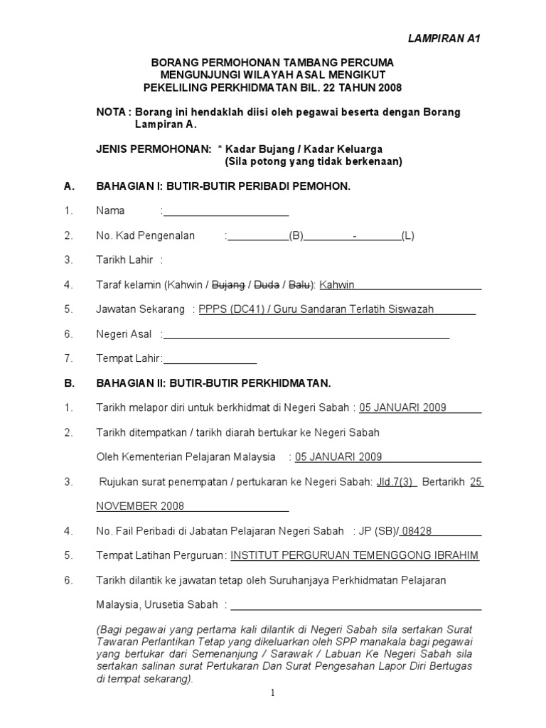 Borangpermohonan Tambang Percuma Mengunjungi Wilayah Asal Mengikut Pekeliling Perkhidmatan Bil Mohd Shahril Academia Edu
