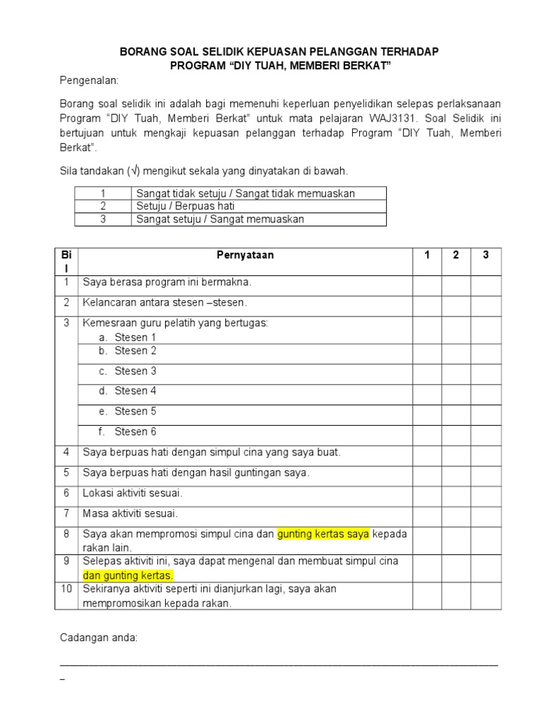 Contoh Borang Soal Selidik Kepuasan Pelanggan Terhadap Produk