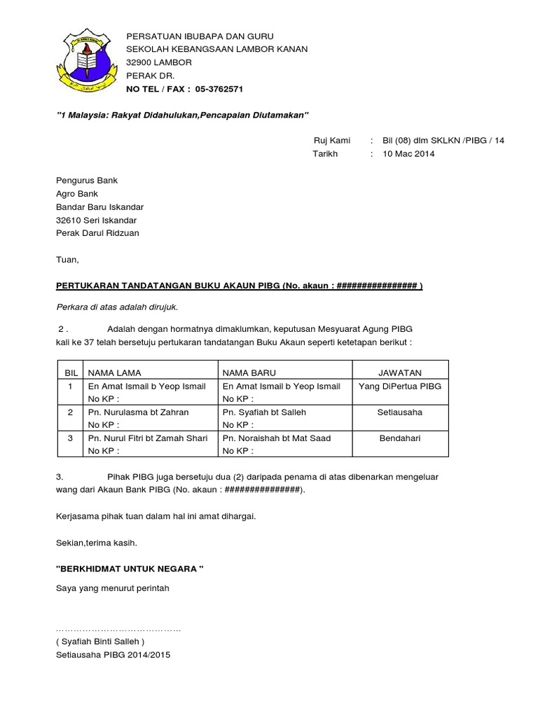 Surat Tukar Penama Akaun Bank Pibg Docx