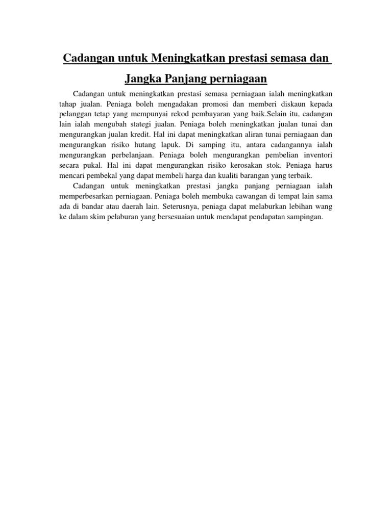 Cadangan Untuk Meningkatkan Prestasi Semasa Dan Jangka Panjang Perniagaan