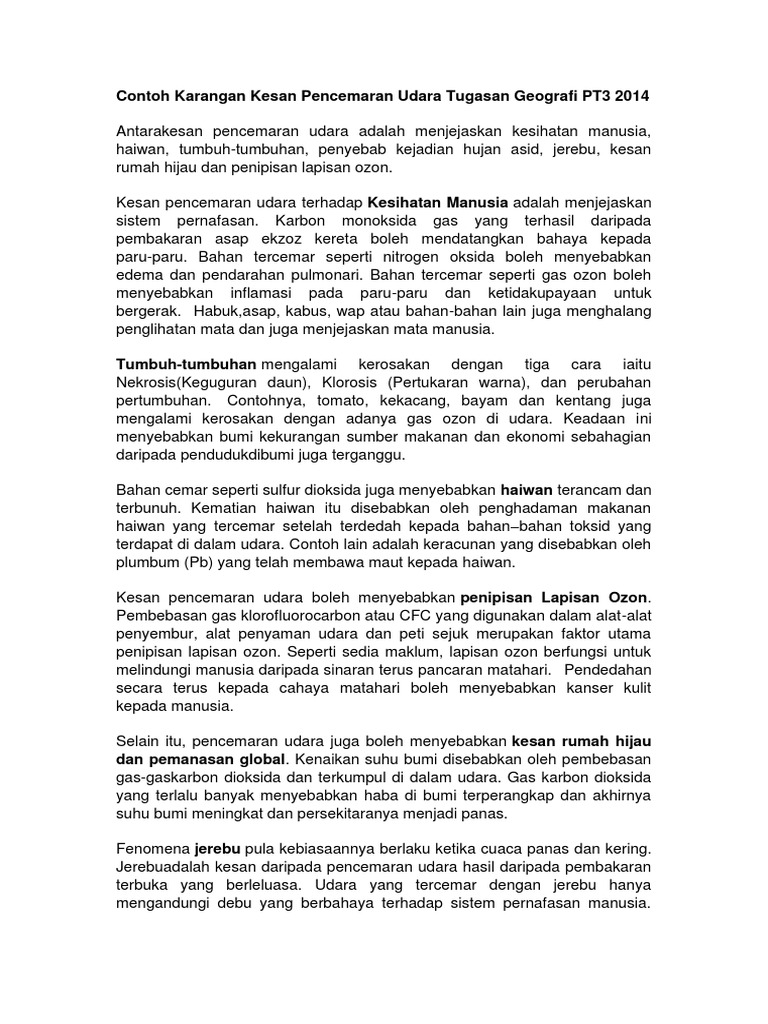 Contoh Karangan Kesan Pencemaran Udara Tugasan Geo Ting 3