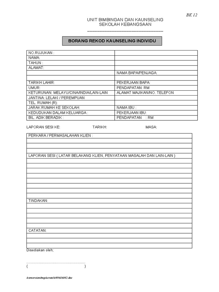 Borang Ubk 12 Borang Rekod Sesi Kaunseling Individu