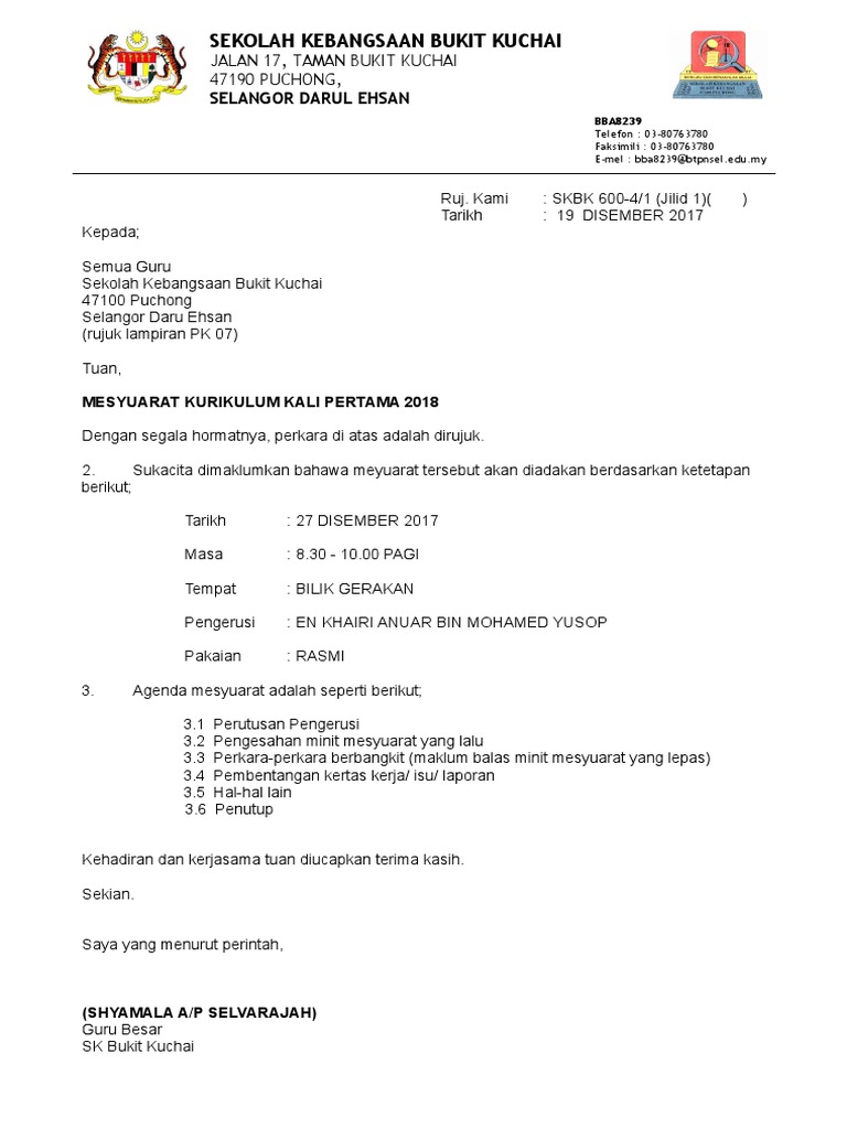 1 Surat Panggilan Mesyuarat Kurikulum Bil 1 2018