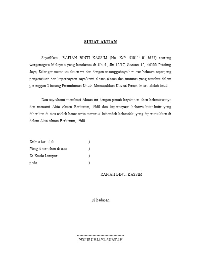 Contoh Surat Akuan Sumpah Kaveat Persendirian