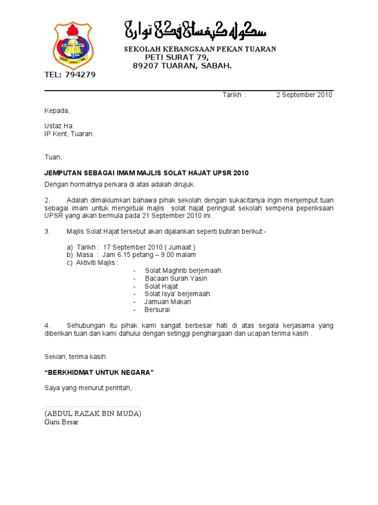Surat Jemputan Imam Solat Hajat Upsr2