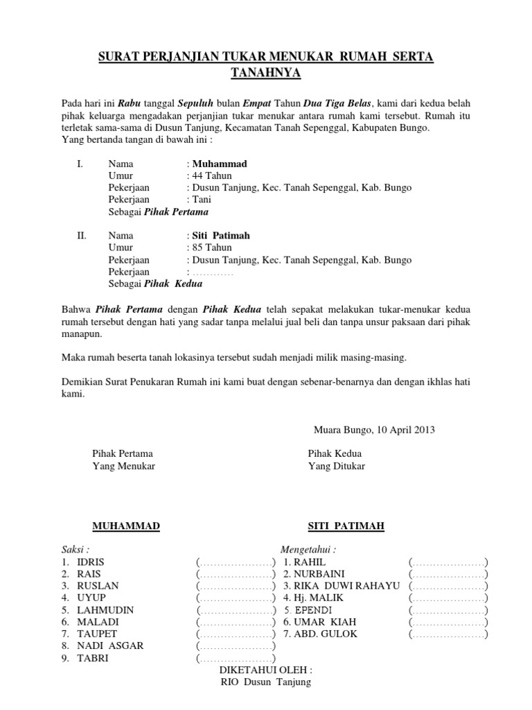 Contoh Surat Perjanjian Tukar Menukar Tanah Kumpulan Surat Penting