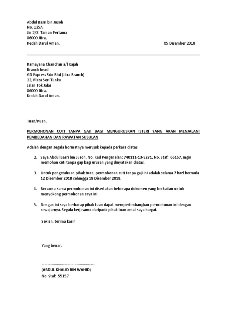 Surat Rasmi Untuk Permohonan Cuti Tanpa Gaji Kecemasan C