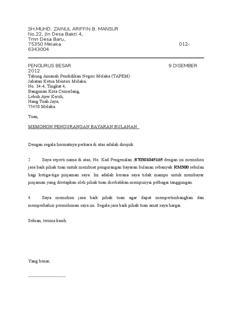 Contoh Surat Rayuan Pengurangan Bayaran Hutang Bulanan Ansuran Dan Lain Lain