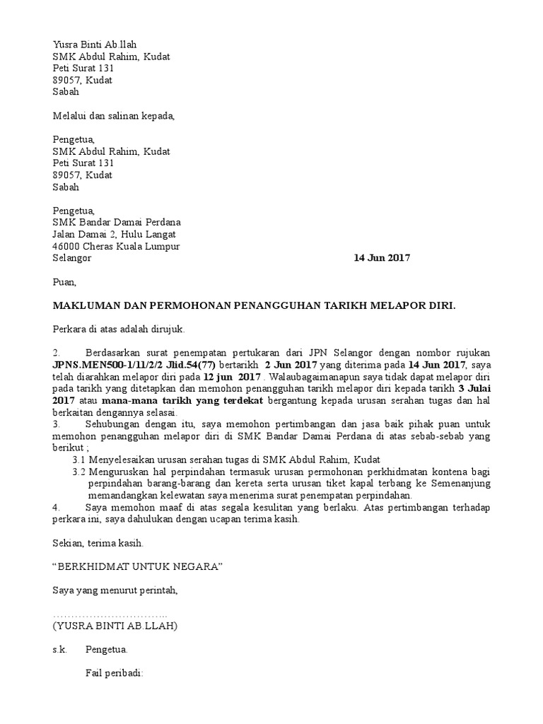 Contoh Surat Rasmi Permohonan Penangguhan Lapor Diri