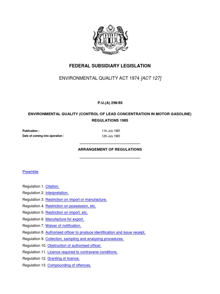 Environmental Quality Act 1974 Act 127 Subsidiary Legislation