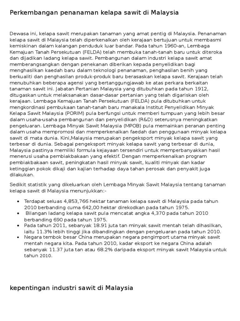 Perkembangan Penanaman Kelapa Sawit Di Malaysia