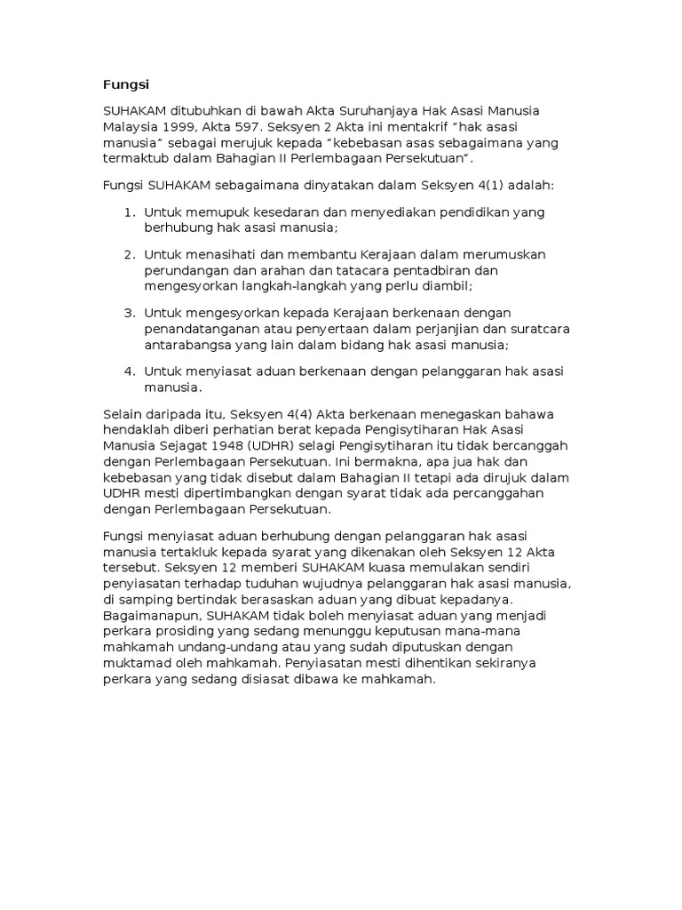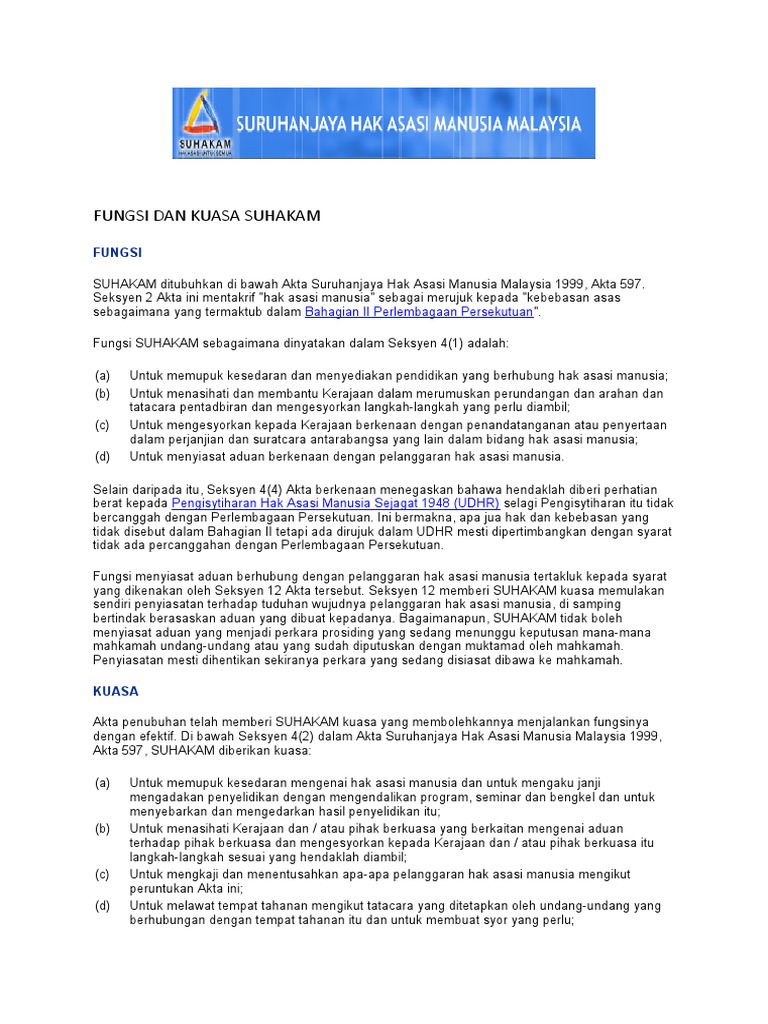 Suruhanjaya Hak Asasi Manusia Malaysia Suhakam Functions Powerfungsi Kuasa Suruhanjaya Hak Asasi Manusia Malaysia Suhakam