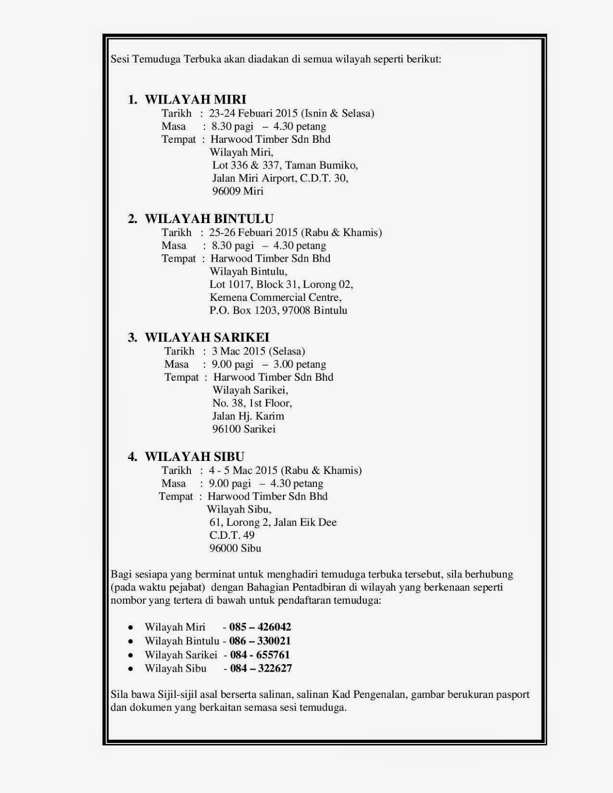 Open Interview Harwood Timber Sdn Bhd Sarawak Miri Bintulu Sarikei Sibu Deadline 23 24 25 26 February 3 4 5 March 2015 Azam Kerja Borneo