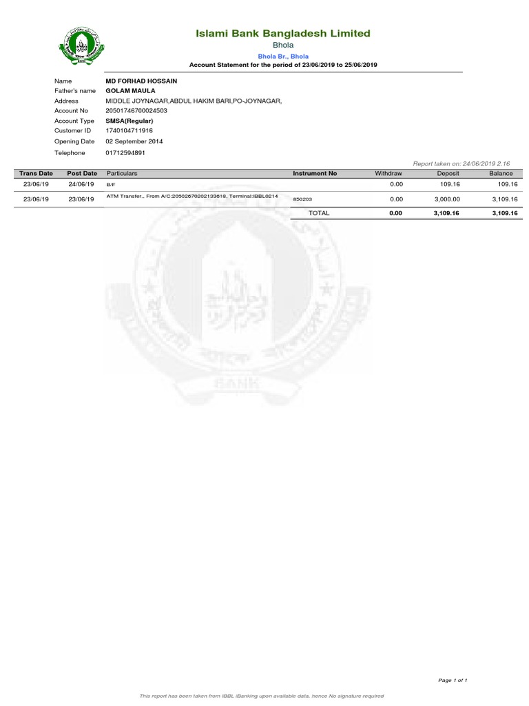 Islami Bank Bangladesh Bank Statement