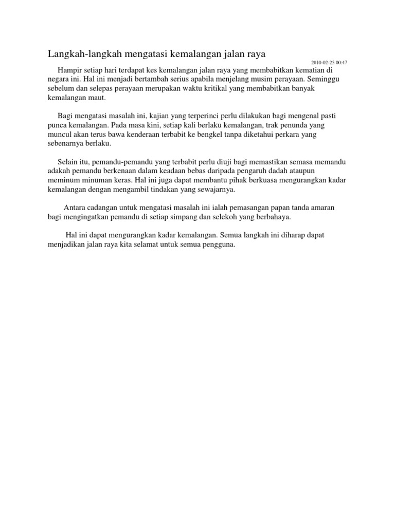 Karangan Langkah Langkah Mengatasi Kemalangan Jalan Raya Di Negara Kita