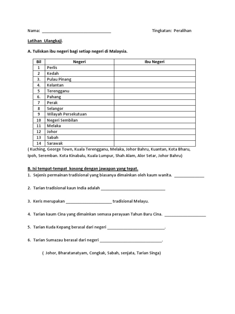 Latihan Ulangkaji A Tuliskan Ibu Negeri Bagi Setiap Negeri Di Malaysia Bil Negeri Ibu Negeri