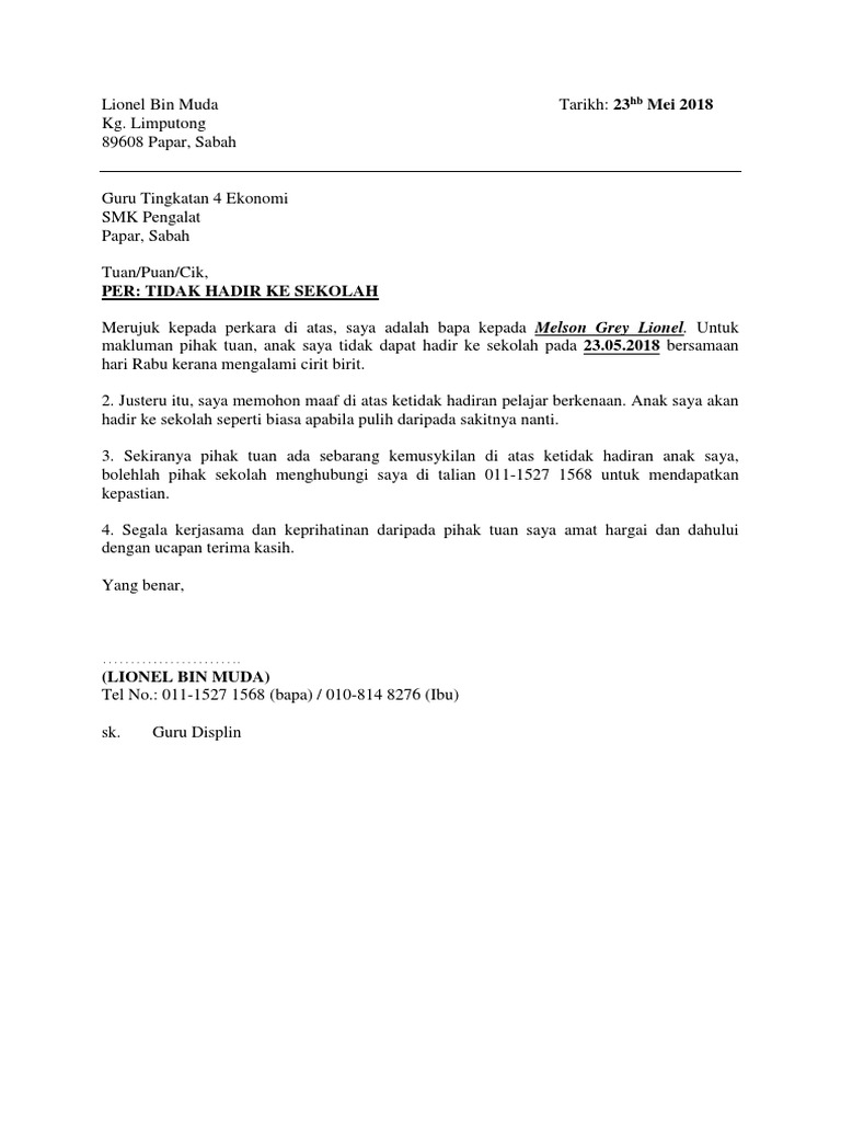 Contoh Surat Tidak Hadir Ke Sekolah Kerana Sakit Perut Tanpa Surat Doktor Atau Mc Docx