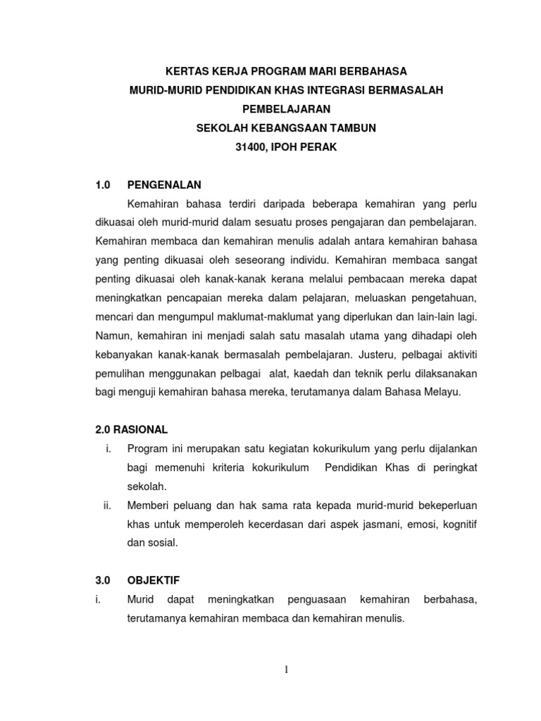 Kertas Kerja Program Mari Berbahasa Murid Murid Pendidikan Khas Integrasi Bermasalah Pembelajaran Sekolah Kebangsaan Tambun 31400 Ipoh Perak